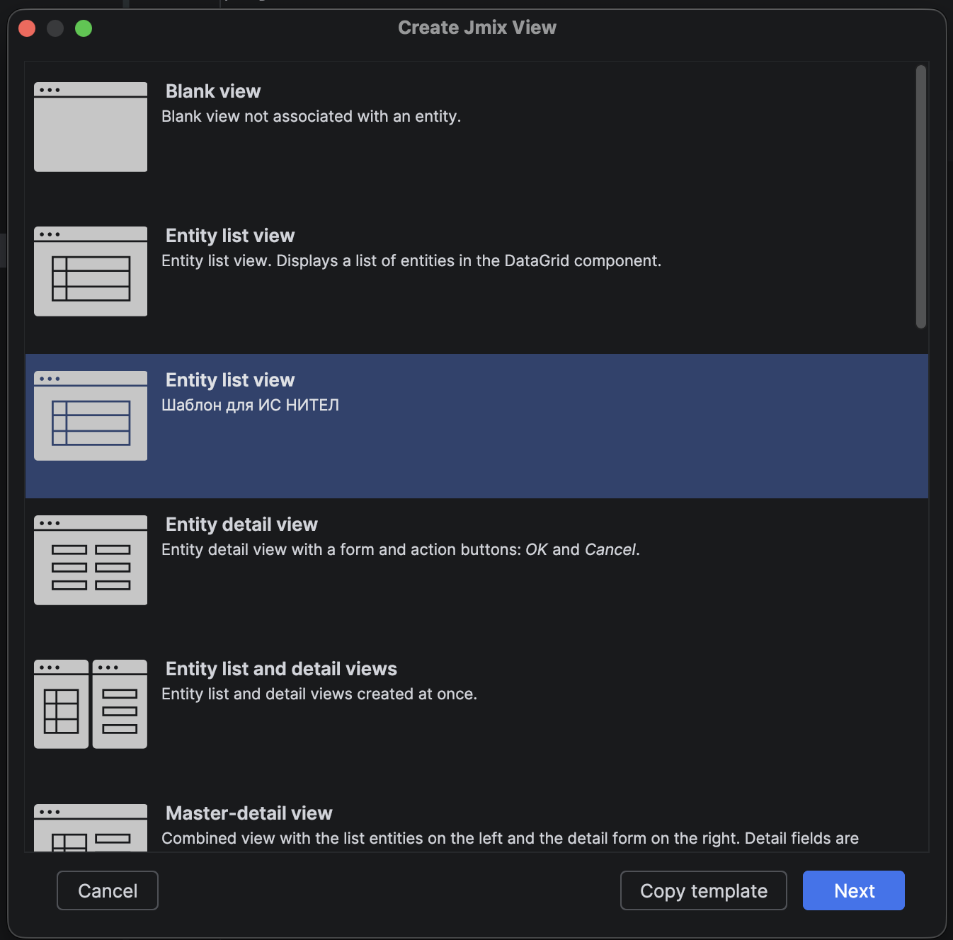Также я скачал репозиторий Jmix, взял оттуда jmix-templates и создал новый проект, в который добавил свой шаблон по пути: content/flowui/моя_папка/мои_файлы_шаблона; в build gradle (оставил его также из репозитория jmix-templates) изменил group на свою и добавил путь для публикации в свой локальный репозиторий, в gradle.properties исправил версию на 2.7.0, далее в другом проекте подключил зависимость в build.gradle и добавили ее в Additional templates artifact, почистил кеш и перезапустил idea. При создании view для сущности моего шаблона нет.